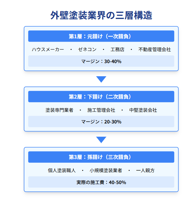 下請け→孫請け構造により、実際工事する塗装職人は、安い賃金で働いているのが現状です。